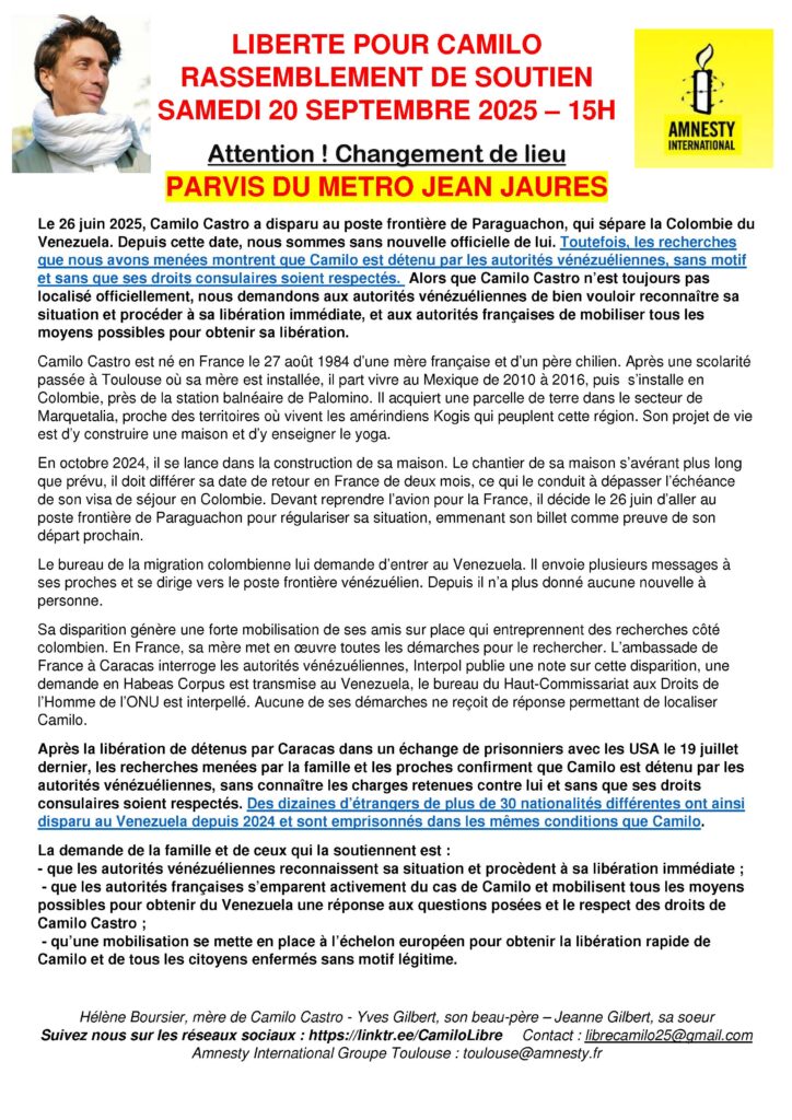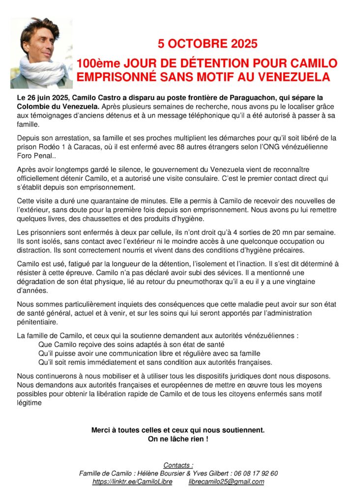 Depuis fin juin, vous savez par la presse que Camilo Castro est emprisonné au Vénézuela (confirmation obtenue par un détenu libéré).