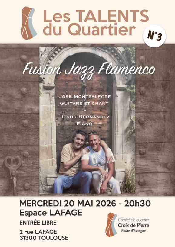 Mercredi 20 Mai 2026 20h30 2 rue Lafage Talents de Quartier N°3 : Fusion Jazz et Flamenco José Montealegre et Jésus Hernandez (guitare chants et piano)